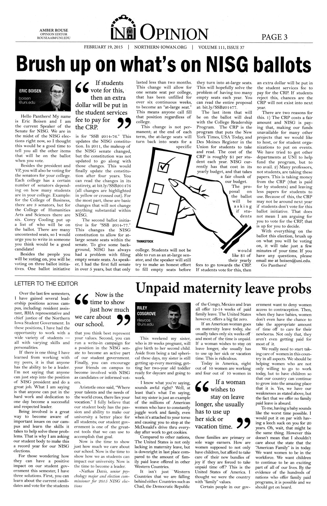 | Brush up on what's on NISG ballots | Student Eric Boisen goes over what the 2015 NISG ballot contains, and what it means for students; photo. |