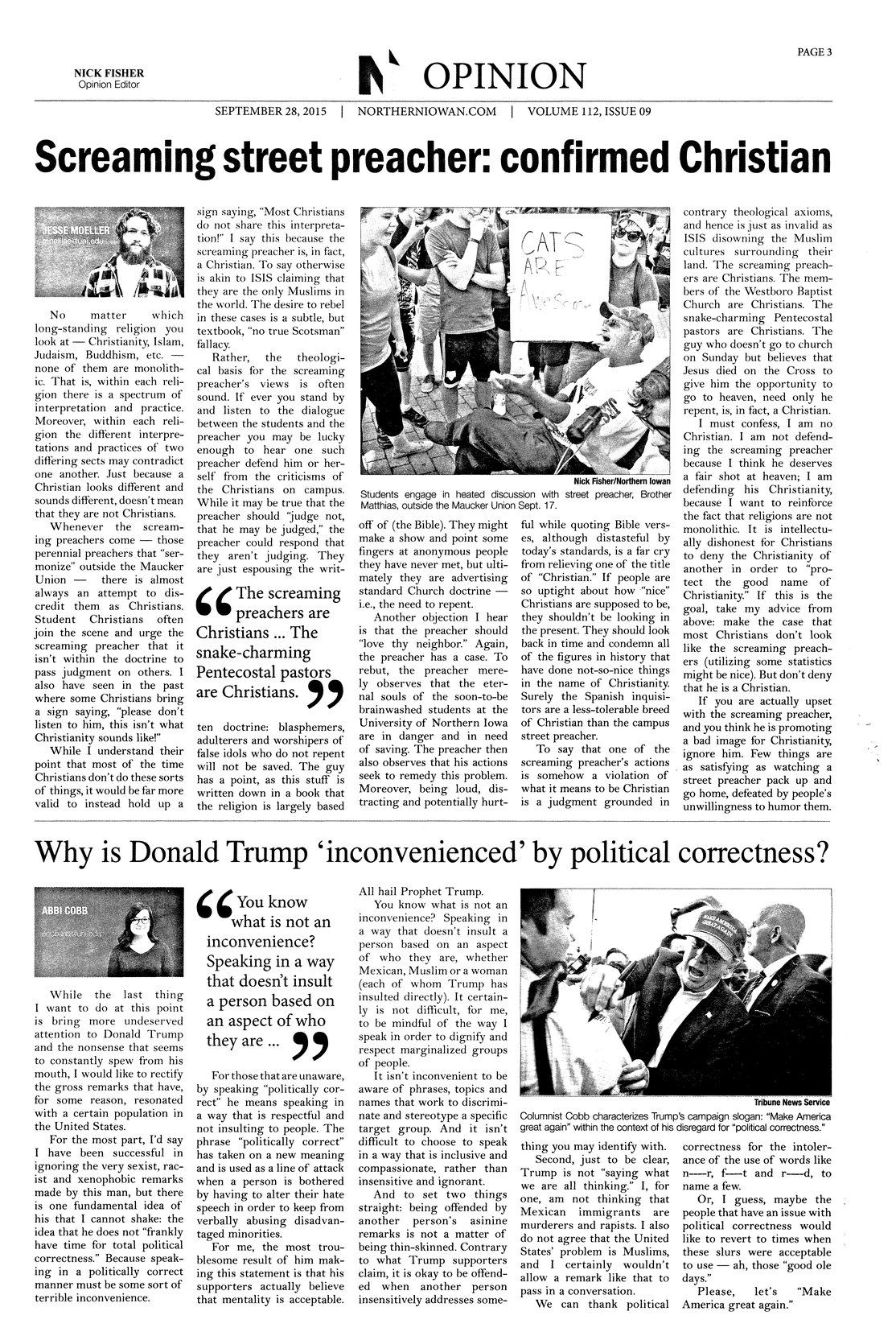 | Screaming street preacher: confirmed Christian | In the author's opinion, despite students who disagree with the content and style of the street preachers who come to UNI, they are Christians; photos. |