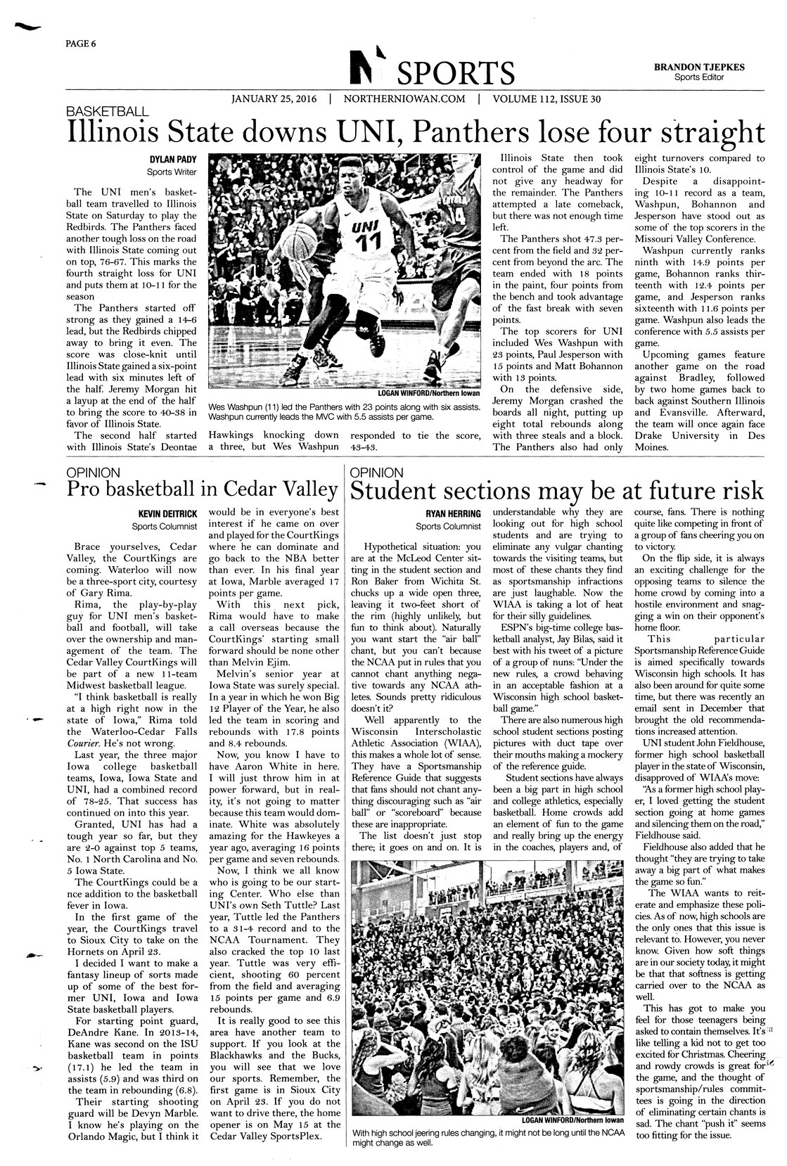 | Illinois State downs UNI, Panthers lose four straight | The men's basketball team lost to Illinois State University, 76-67; photo. |