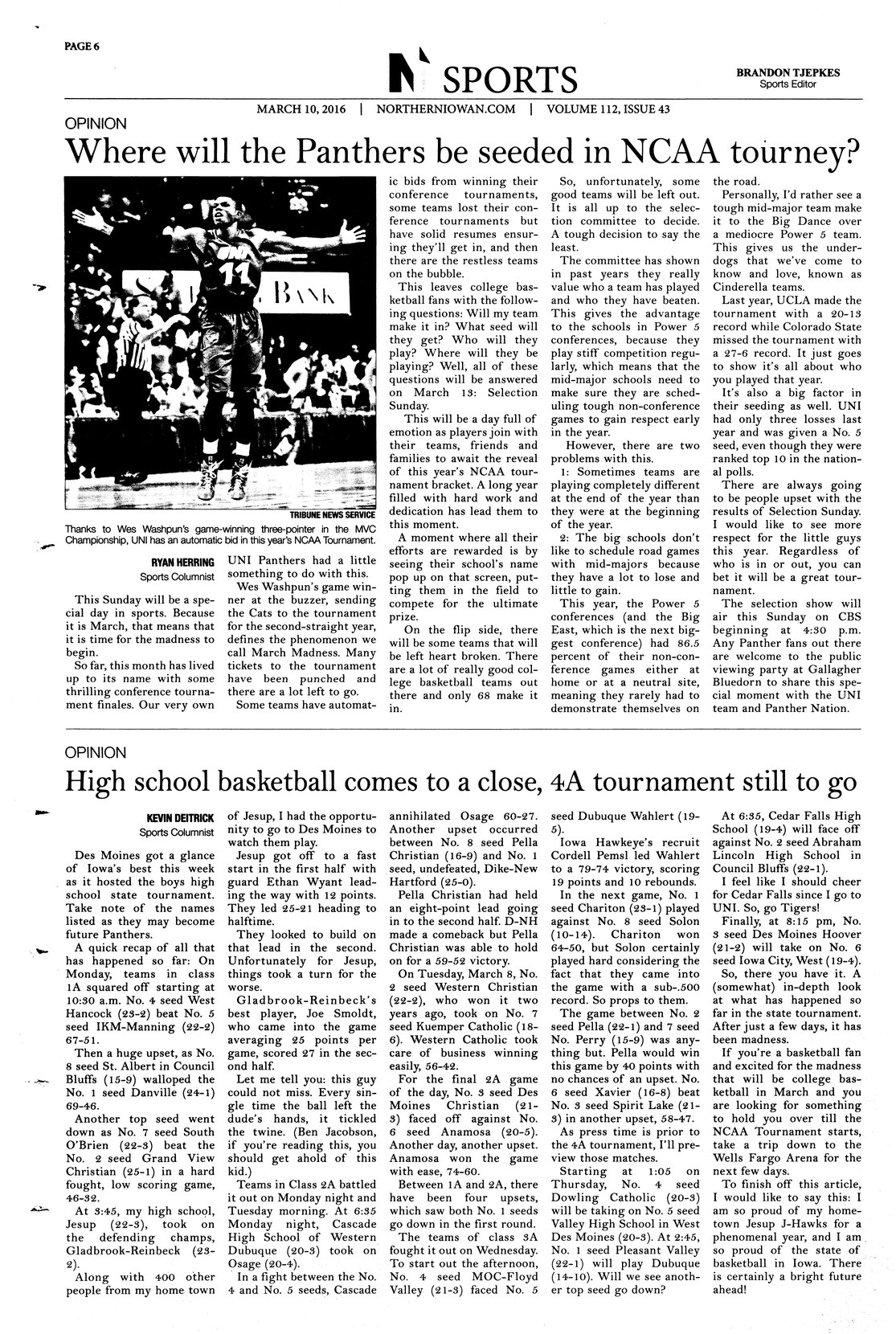 | Where will the Panthers be seeded in NCAA tourney? | Herring writes an opinion about the upcoming NCAA basketball March Madness tournament's Selection Sunday and discusses the UNI men's team; photo. |