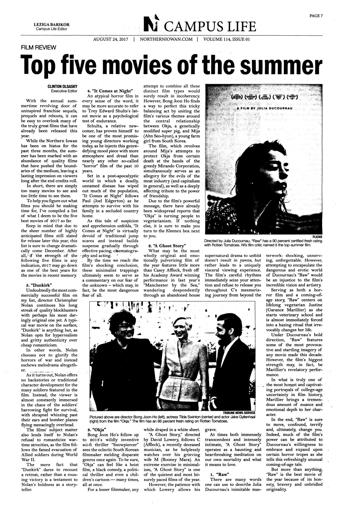 | Top five movies of the summer | Olsasky reviews the movies, in his opinion, were the best of the summer. The movies he reviewed were "Dunkirk", "It Comes at Night", "Okja", "A Ghost Story", and "Raw"; photo. |