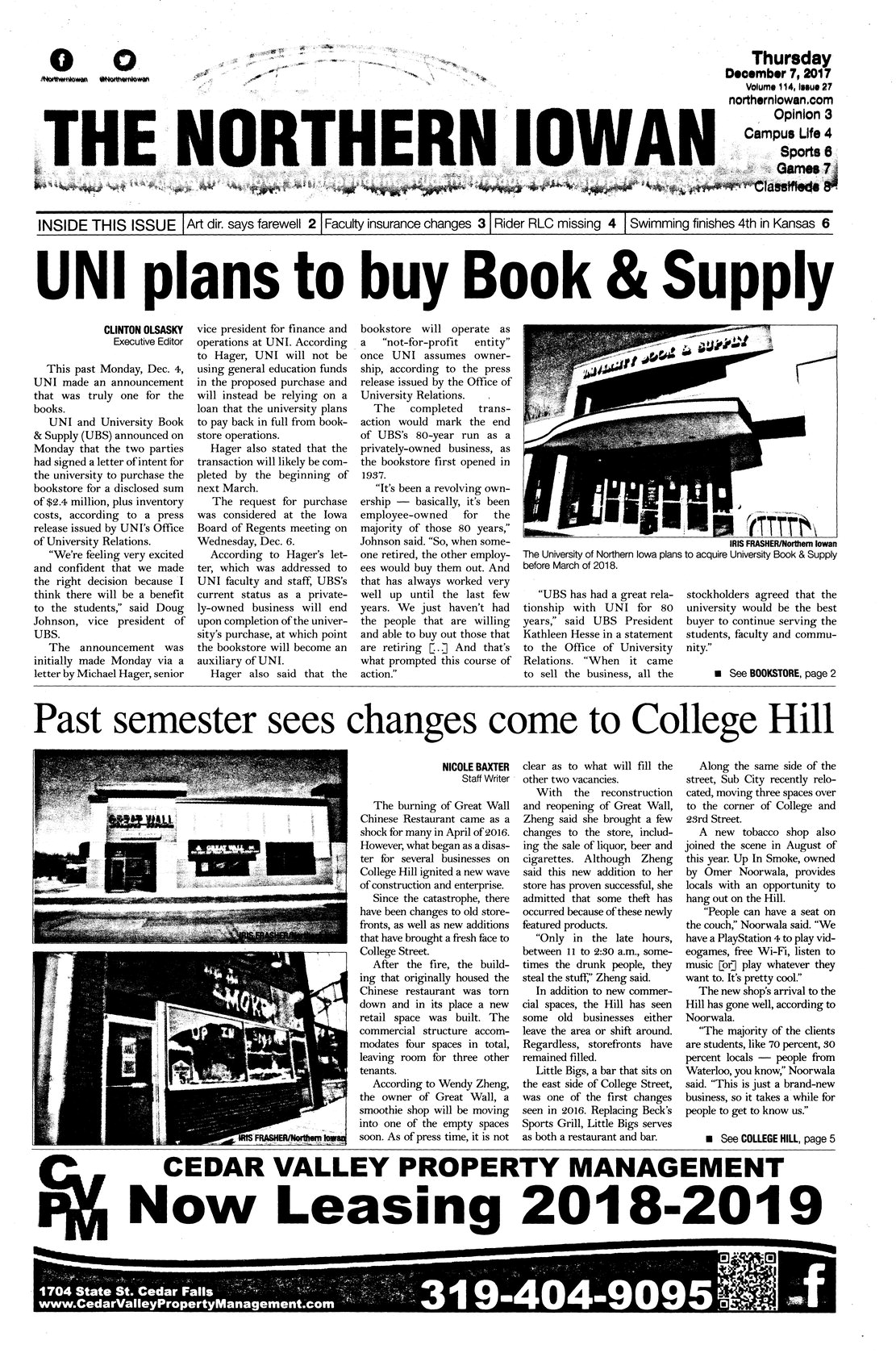 | UNI plans to buy Book & Supply | UNI and University Book & Supply (UBS) signed a letter of intent for the university to purchase the privately-owned bookstore for $2.4 million plus inventory cost before March 2018; photos. |