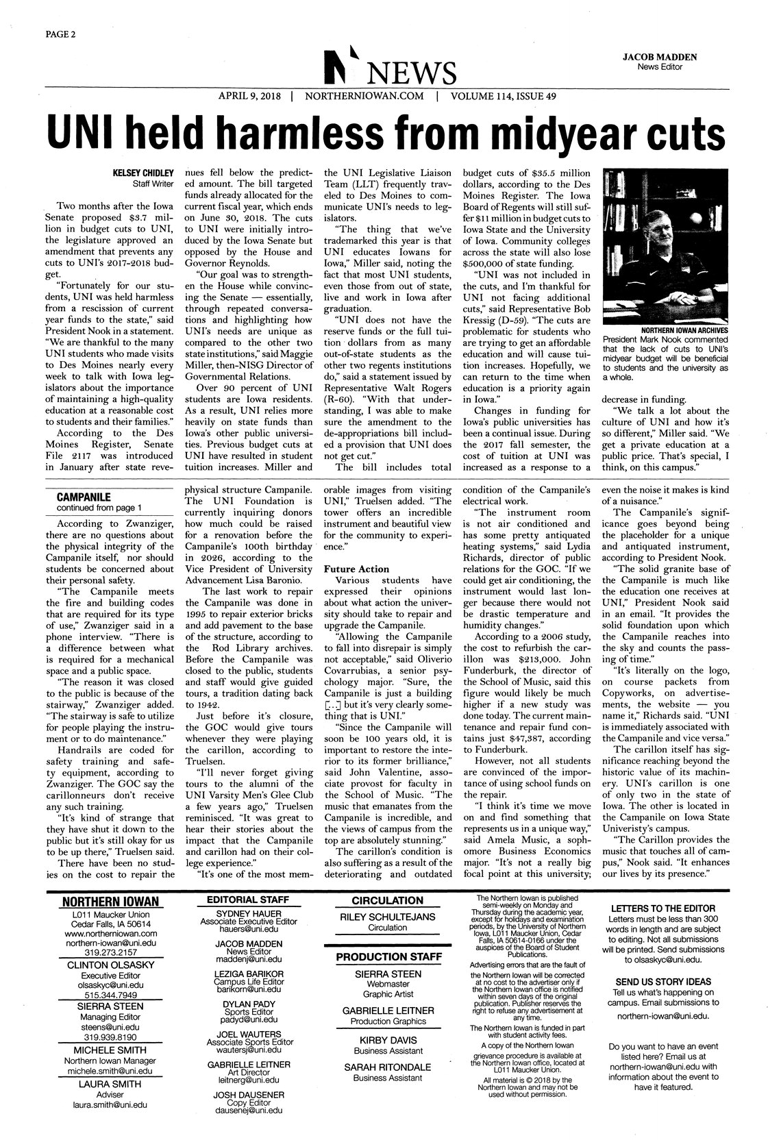 | UNI held harmless from midyear cuts | The budget cuts proposed by the Iowa Senate will not affect UNI and tuition costs. |