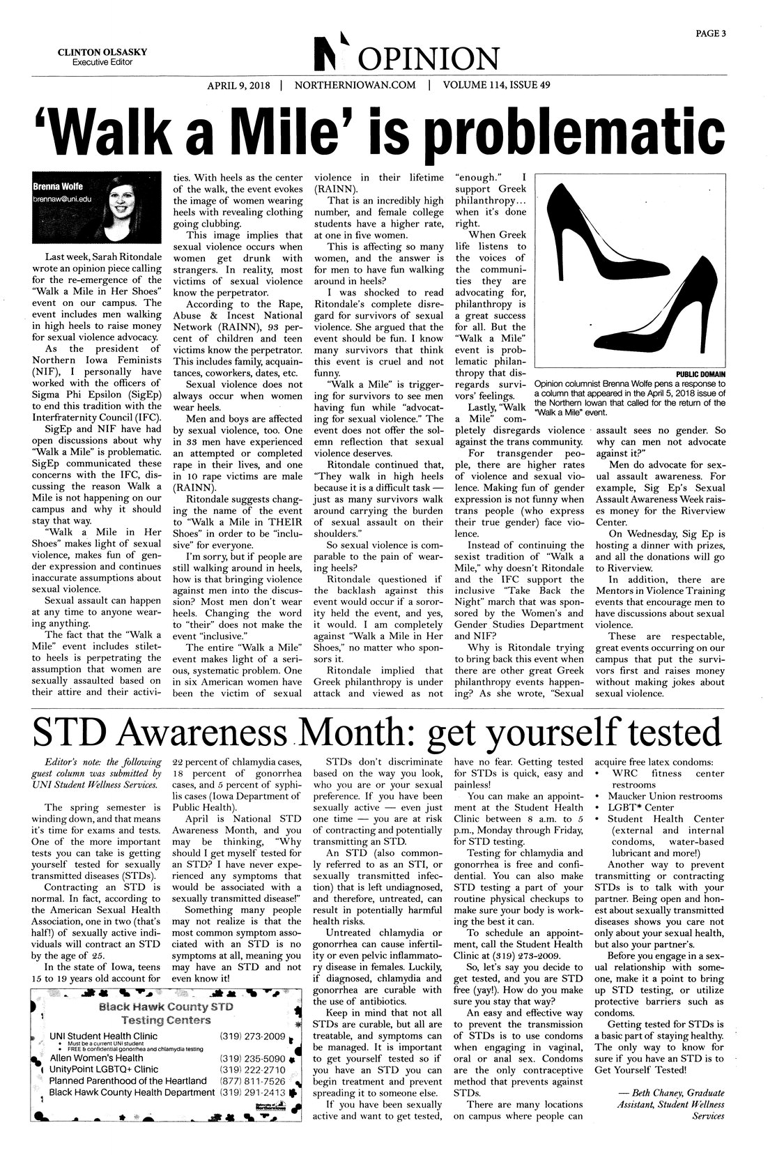 | 'Walk a Mile' is problematic | The author shares her opinion on a recent column calling for 'Walk a Mile in Her Shoes,' a walk meant to raise awareness of sexual assault that was originally hosted by Sigma Phi Epsilon. Th author disagrees with the original column and shares why she thinks it's problematic. |