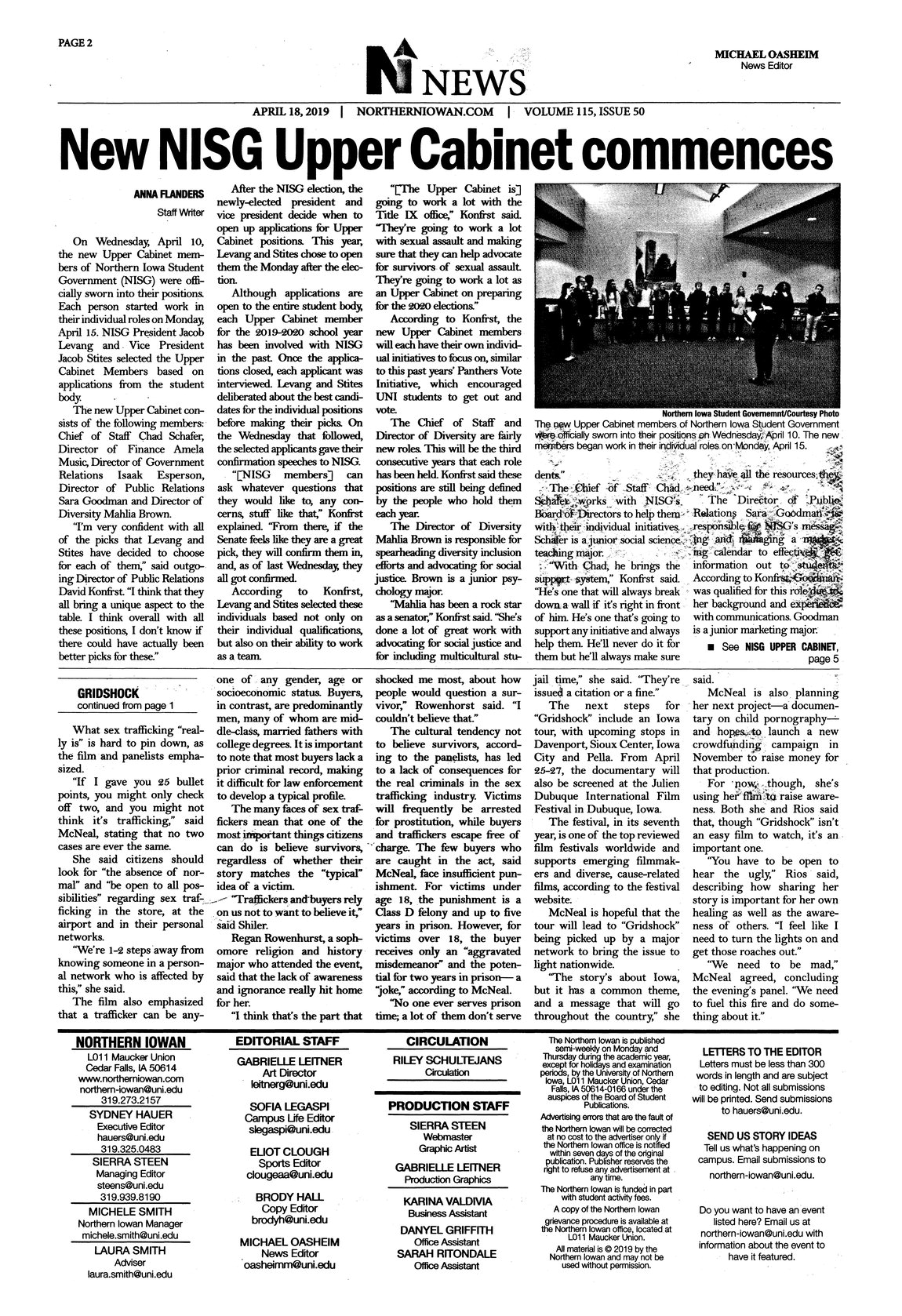 | New NISG Upper Cabinet commences | Northern Iowa Student Government (NISG) Upper Cabinet positions, selected from applications by newly-elected president Jacob Levang and vice President Jacot Stites, were sworn in on April 10. They include Chad Schafer as Chief of Staff, Amela Music as director of finance, Isaak Esperson as director of government relations, Sara Goodman as director of public relations, and Mahlia Brown as director of diversity; photo. |