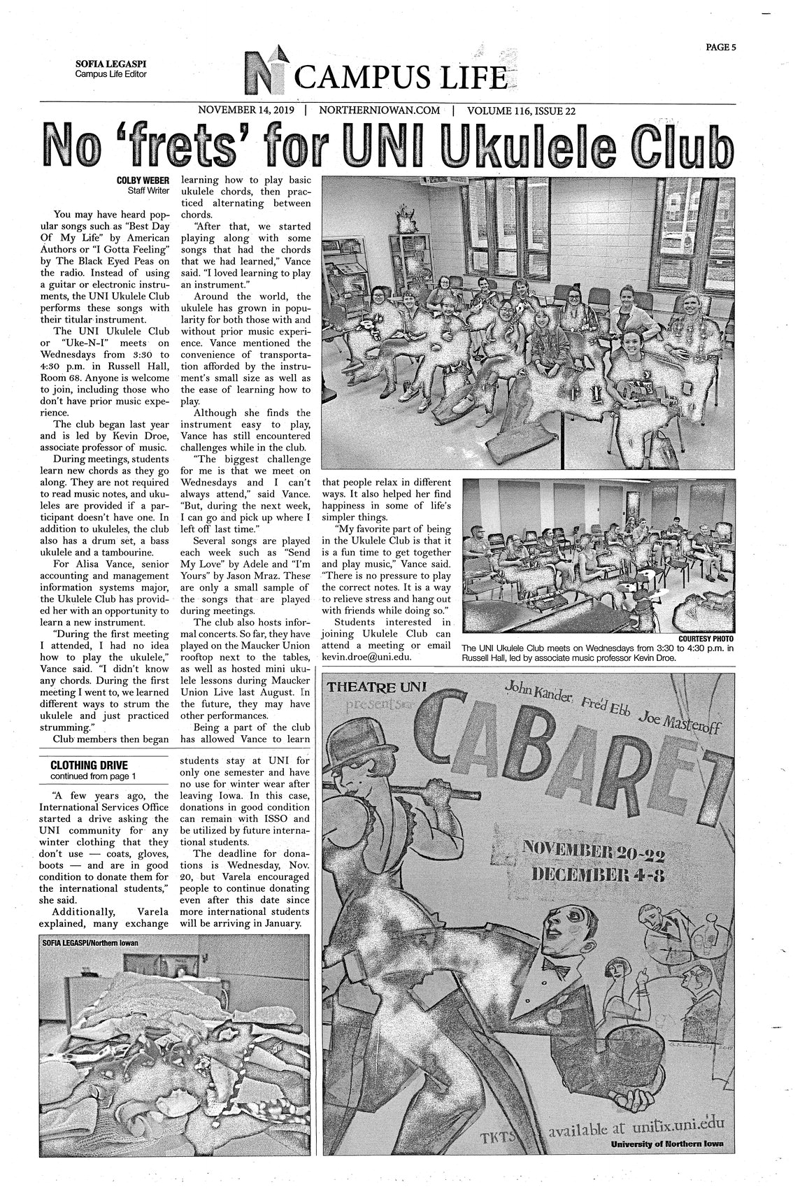 | No 'frets' for UNI Ukulele Club | The UNI Ukulele Club welcomes students with or without a musical background to learn to play the instrument. It was founded in 2018 and is advised Kevin Droe, associate professor of music. The club meets on Wednesdays and has played formal concerts; photo. |