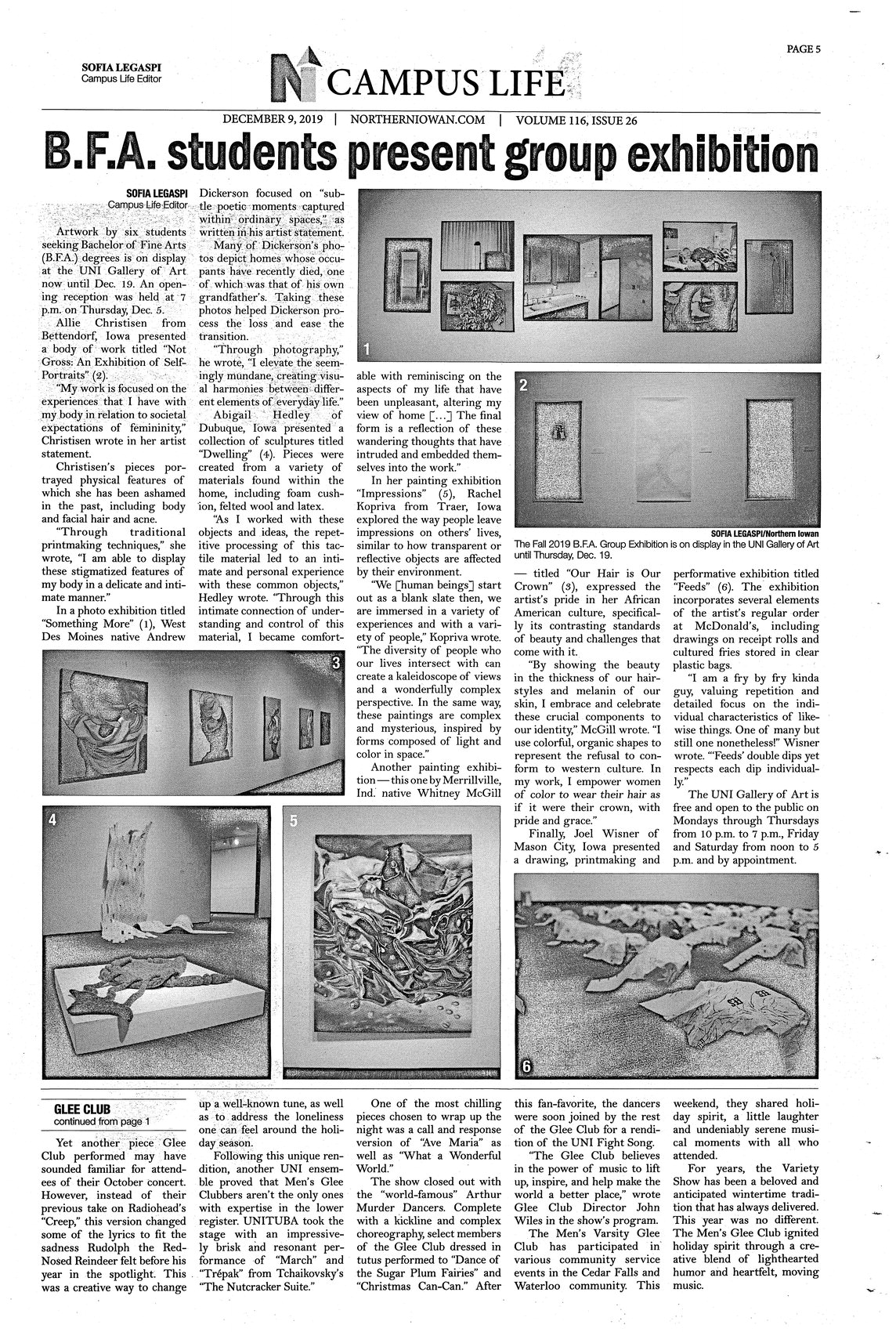 B.F.A. students present group exhibition Artwork by six students seeking their Bachelor of Fine Arts (B.F.A.) degrees is on display at the UNI Gallery of Art from now until December 19. An opening reception was held at 7 p.m. on Thursday, December 5; photos.
