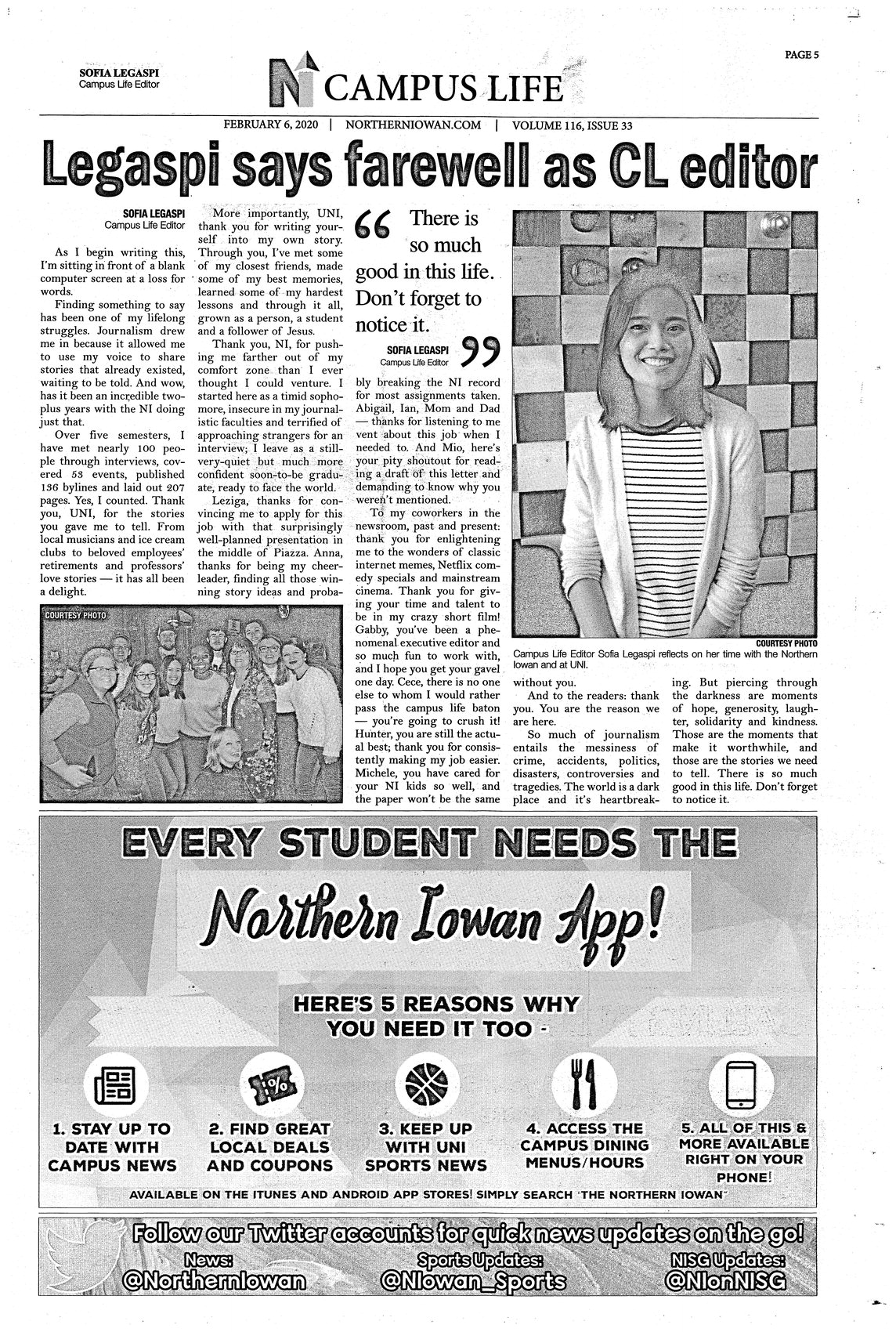Legaspi says farewell as CL editor Sophia Legaspi reflects on five semesters at the Northern Iowan and thanks family, friends, coworkers, and readers for their support and encouragement; photos.