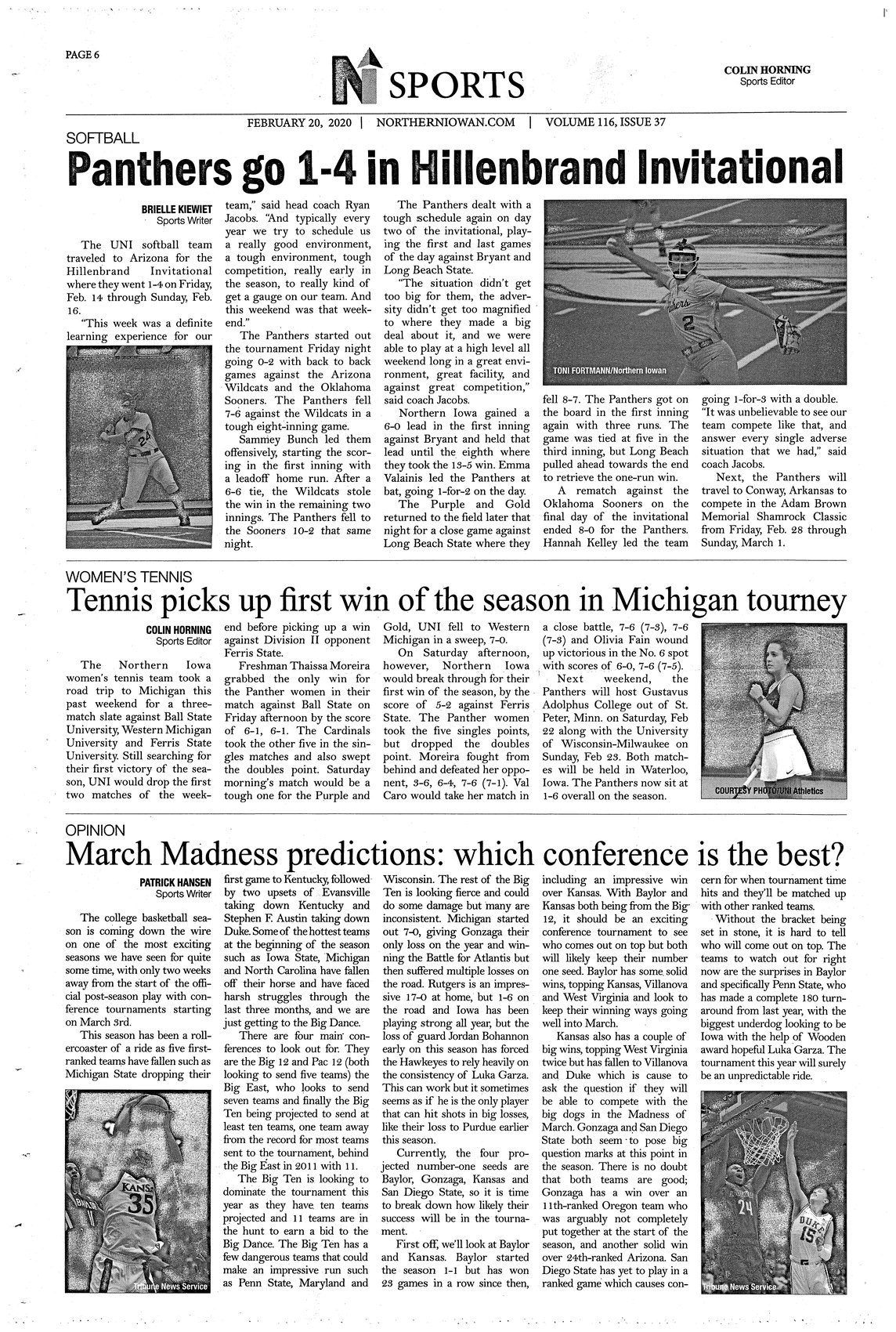 | Panthers go 1-4 in Hillenbrand Invitational | The UNI softball team traveled to Arizona for the Hillenbrand Invitational. They were defeated by the Arizona Wildcats after being tied 6-6; the Oklahoma Sooners, 10-2; won against Bryant 13-5; and lost to Long Beach State, 8-7; photo. |