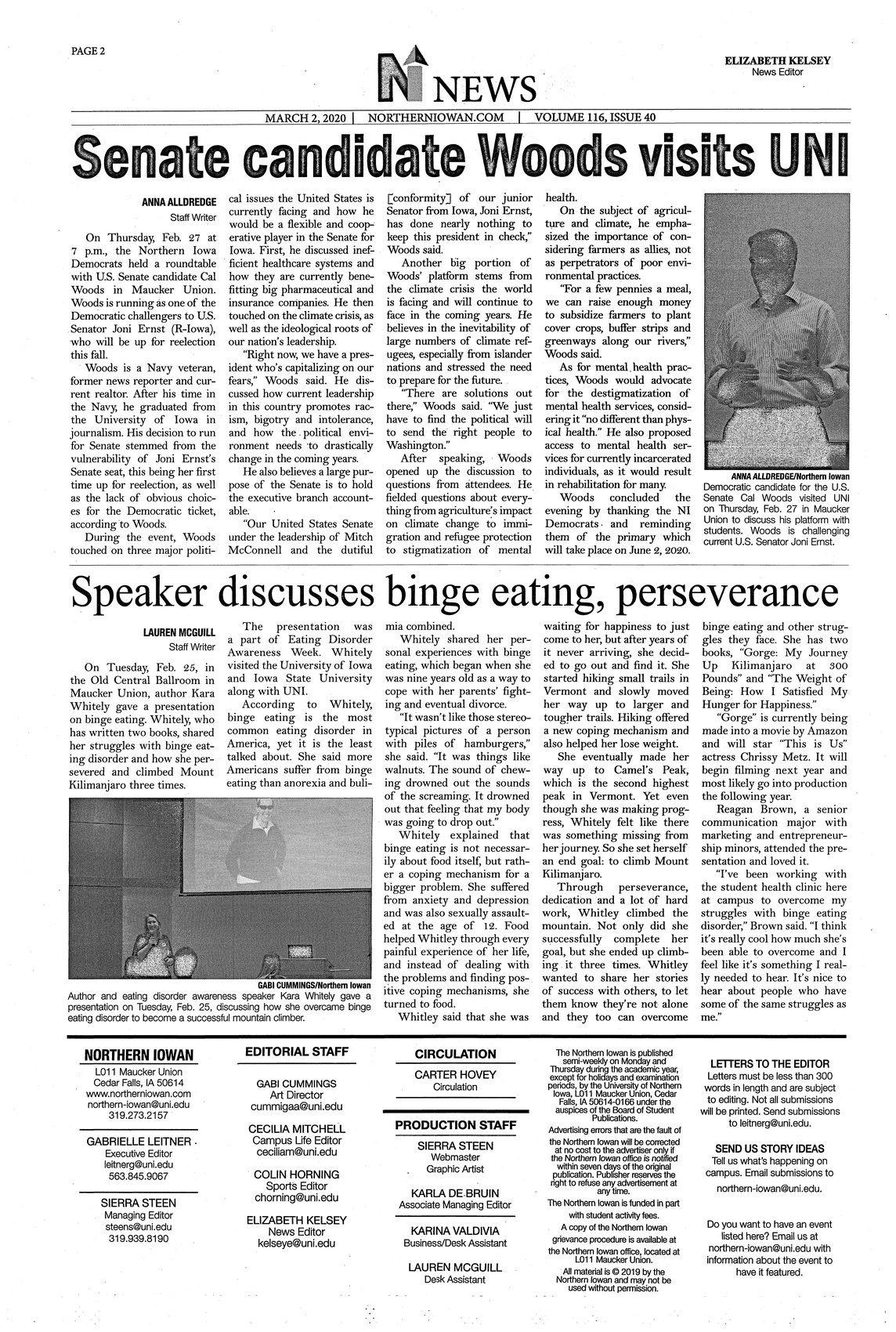 | Senate candidate Woods visits UNI | The Northern Iowa Democrats hosted Iowa U.S. senate candidate Cal Woods in Maucker Union on February 27; Woods was one of the Democratic challengers of senator Joni Ernst; photo. |
