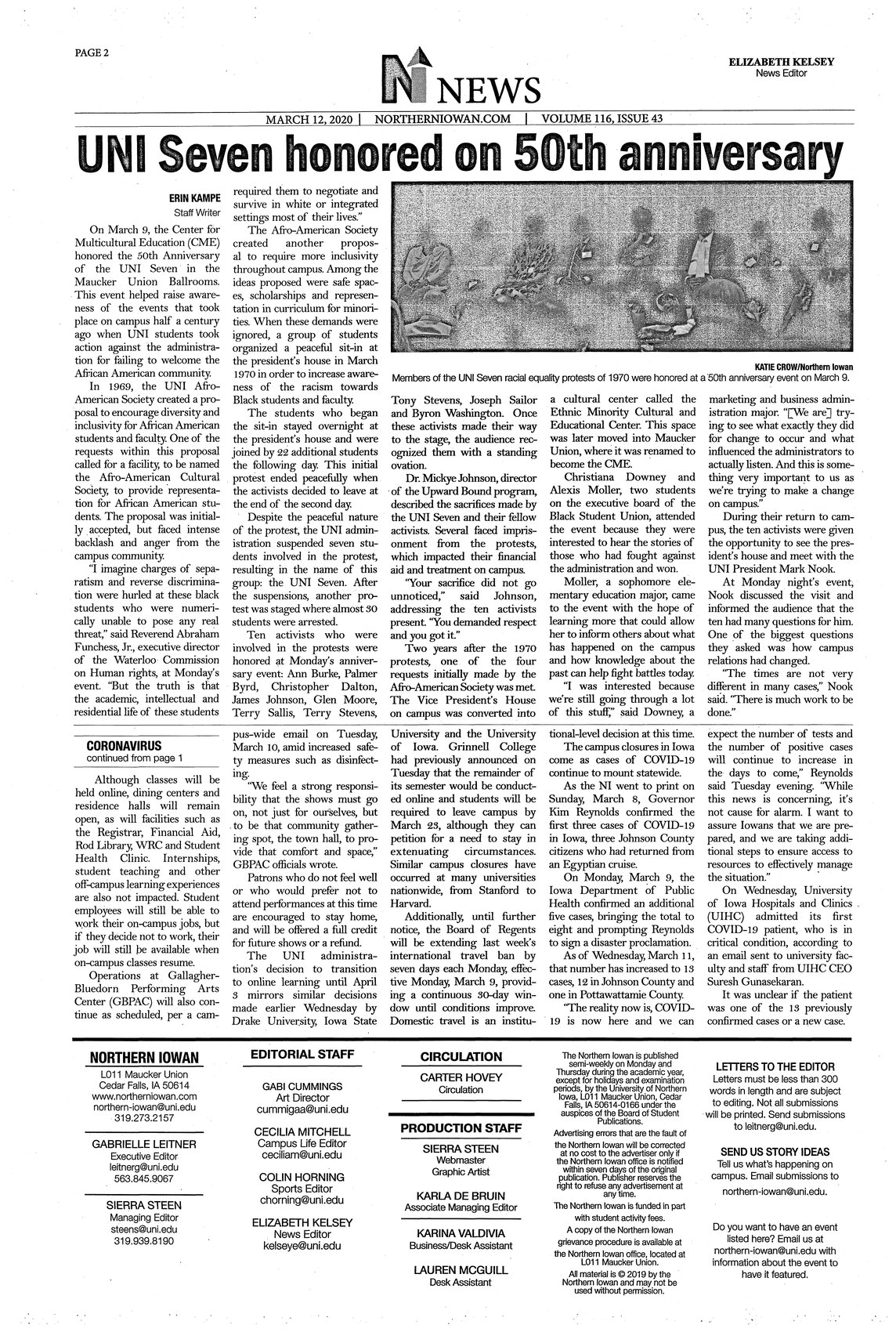 The Center for Multicultural Education (CME) honored the 50th anniversary of the UNI Seven on March 9 in the Maucker Union Ballrooms. The article discusses the 1970 peaceful protests that led to the suspension of seven students - "The UNI 7" - and subsequent protest where almost 30 students were arrested. One of the protest demands was a learning space for people of color - two years later, the vice president's house became the Ethnic Minority Cultural and Educational Center, which evolved into today's CME. Ten activists involved in the protests were present at the event: Ann Burke, Palmer Byrd, Christopher Dalton, James Johnson, Glen Moore, Terry Sallis, Terry Stevens, Tony Stevens, Joseph Sailor, and Byron Washington; photo.