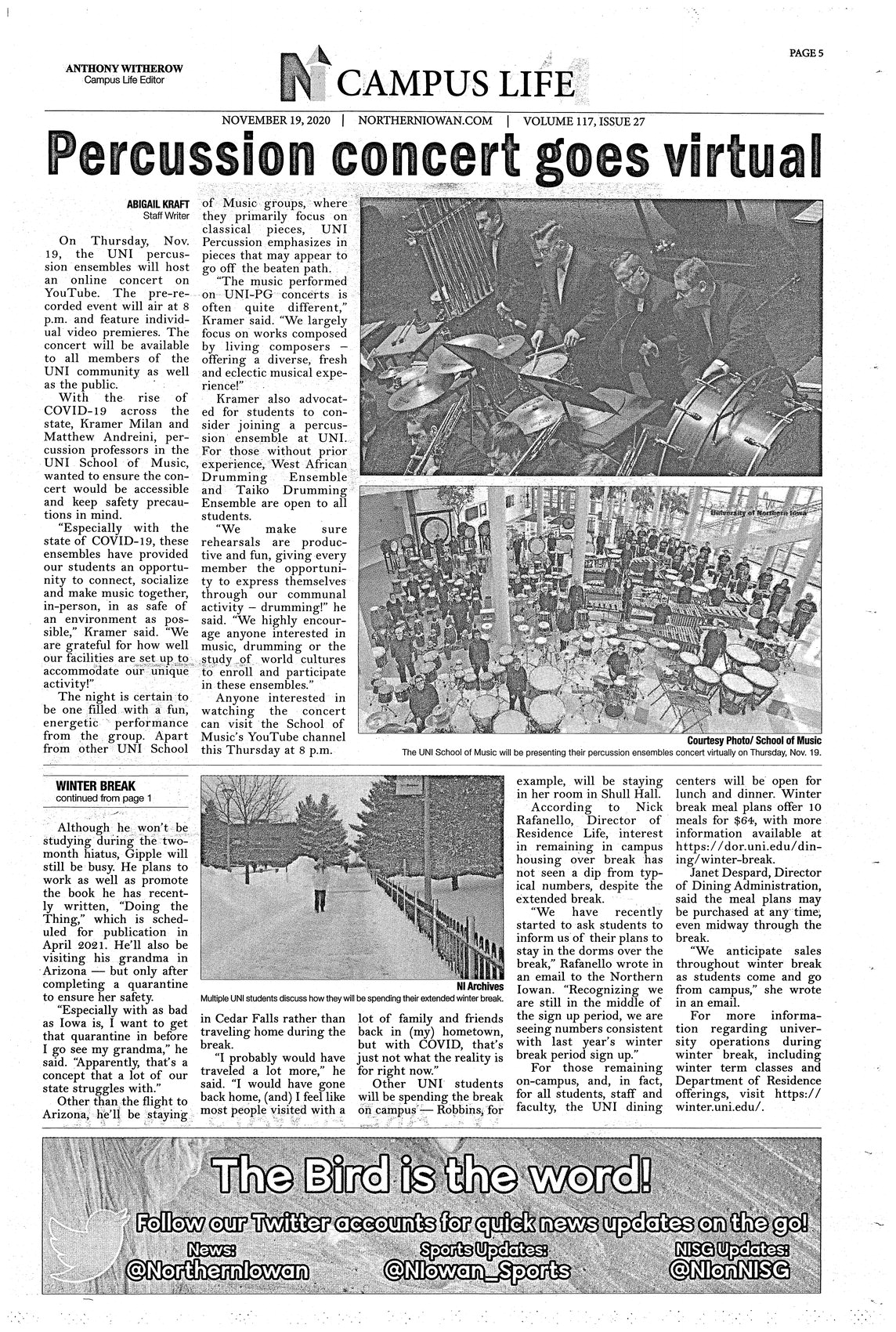 Percussion concert goes virtual UNI School of Music presents various percussion ensembles virtually due to COVID-19 restrictions.