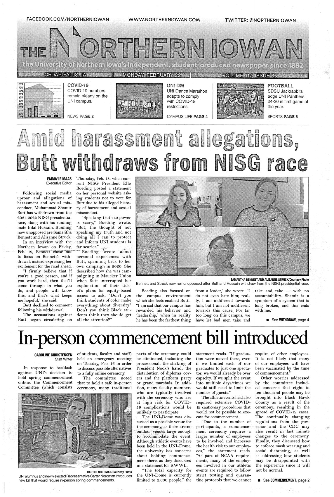 Amid harassment allegations, Butt withdraws from NISG race In the wake of social media allegations of harassment and misconduct, Muhammed Butt and running partner Bilal Hussein withdrew from the Northern Iowa Student Government (NISG) presidential race. The ticket of Samantha Bennet and Alisanne Struck now run unopposed; photo.