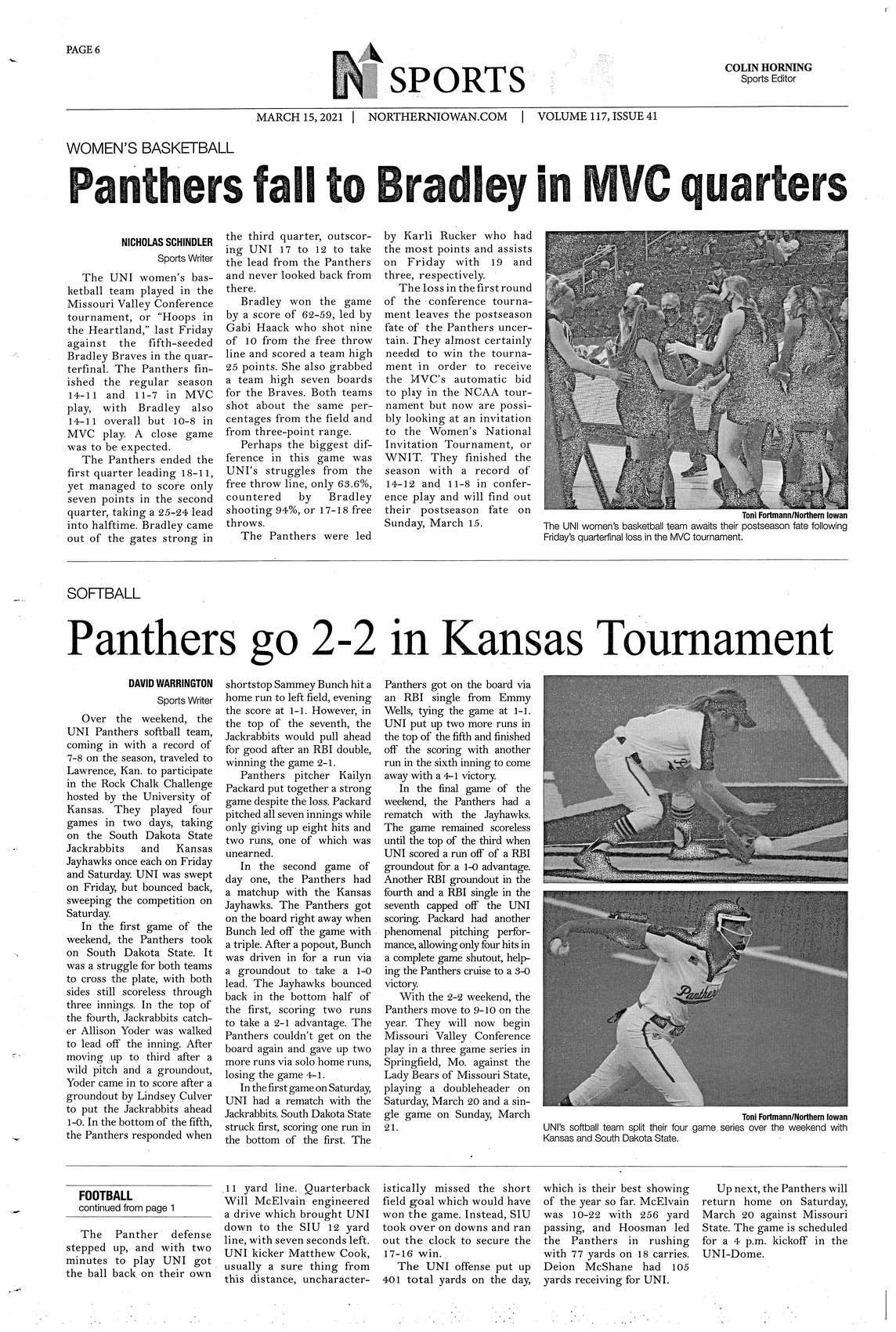 | Panthers go 2-2 in Kansas tournament | The softball team participated in the University of Kansas' Rock Chalk Challenge, playing two games against the South Dakota State Jackrabbits and the Kansas Jayhawks. In their first game, they lost to the Jackrabbits, 2-1. In their second game, they lost to the Jayhawks, 4-1. In their third game, they defeated the Jayhawks, 4-1. In their fourth game, they defeated the Jackrabbits, 4-1. They are 9-10 on the year and are now set to begin Missouri Valley Conference (MVC) play; photos. |