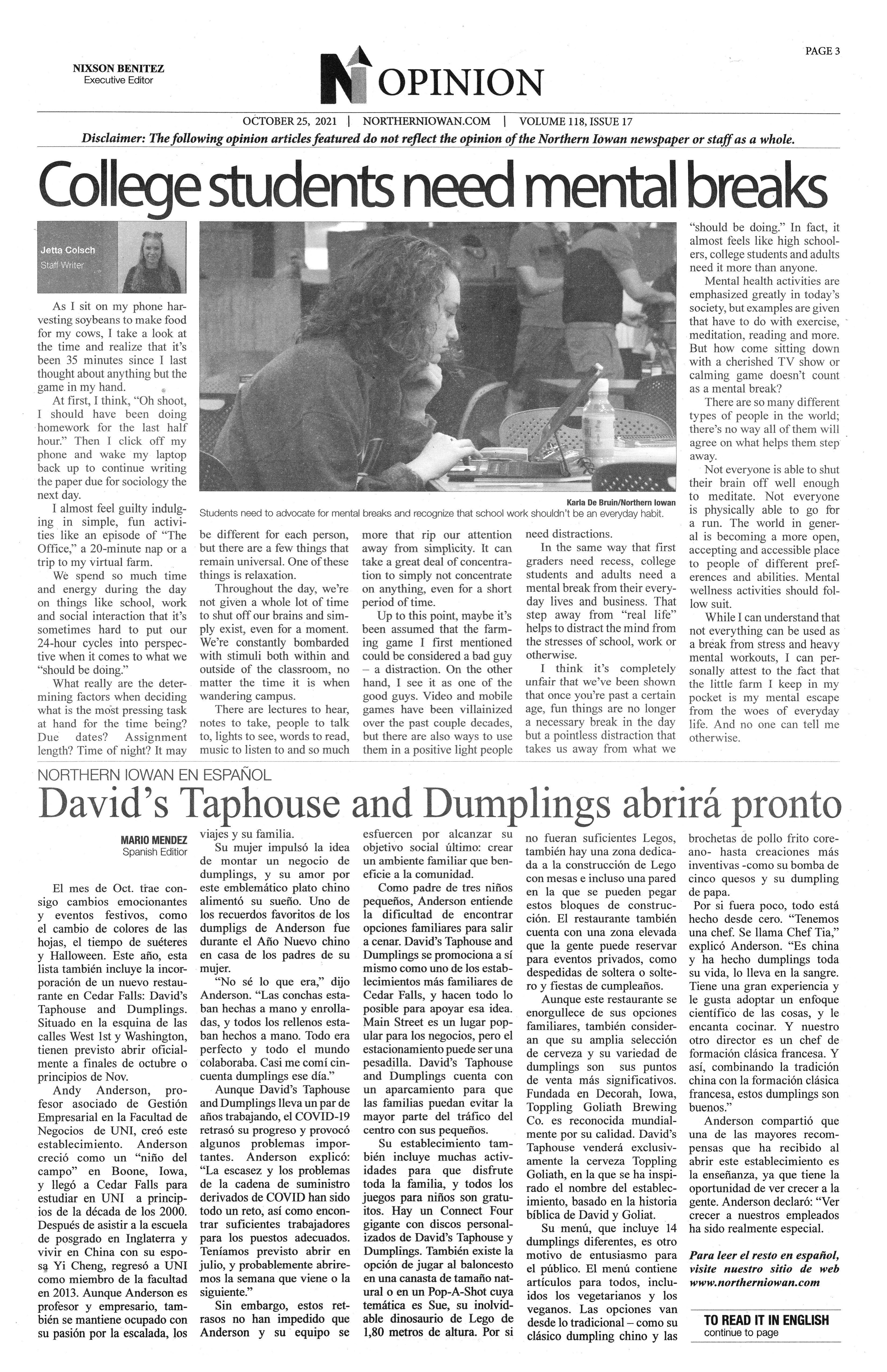 | David's Taphouse and Dumplings abrira pronto | Associate professor of management Andy Anderson opens a new restaurant in Cedar falls: David's Taphouse and Dumplings. Read in English and see photo on page 1. |