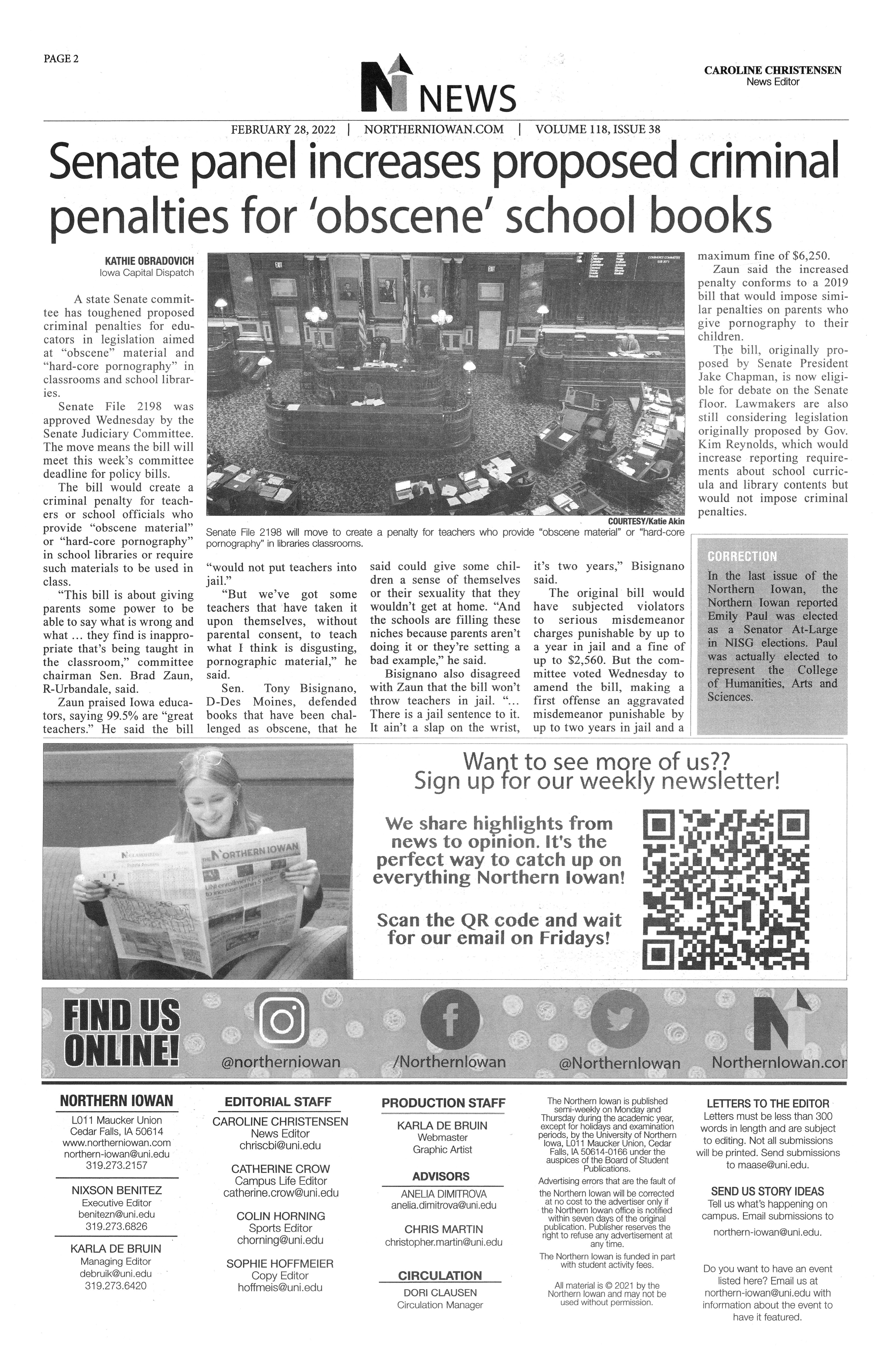 | Senate panel increases proposed criminal penalties for 'obscene' school books | The Iowa Senate Judiciary Committee approved Senate File 2198, which proposes criminal penalties for educators who show "obscene" material in classrooms and school libraries; photo. |