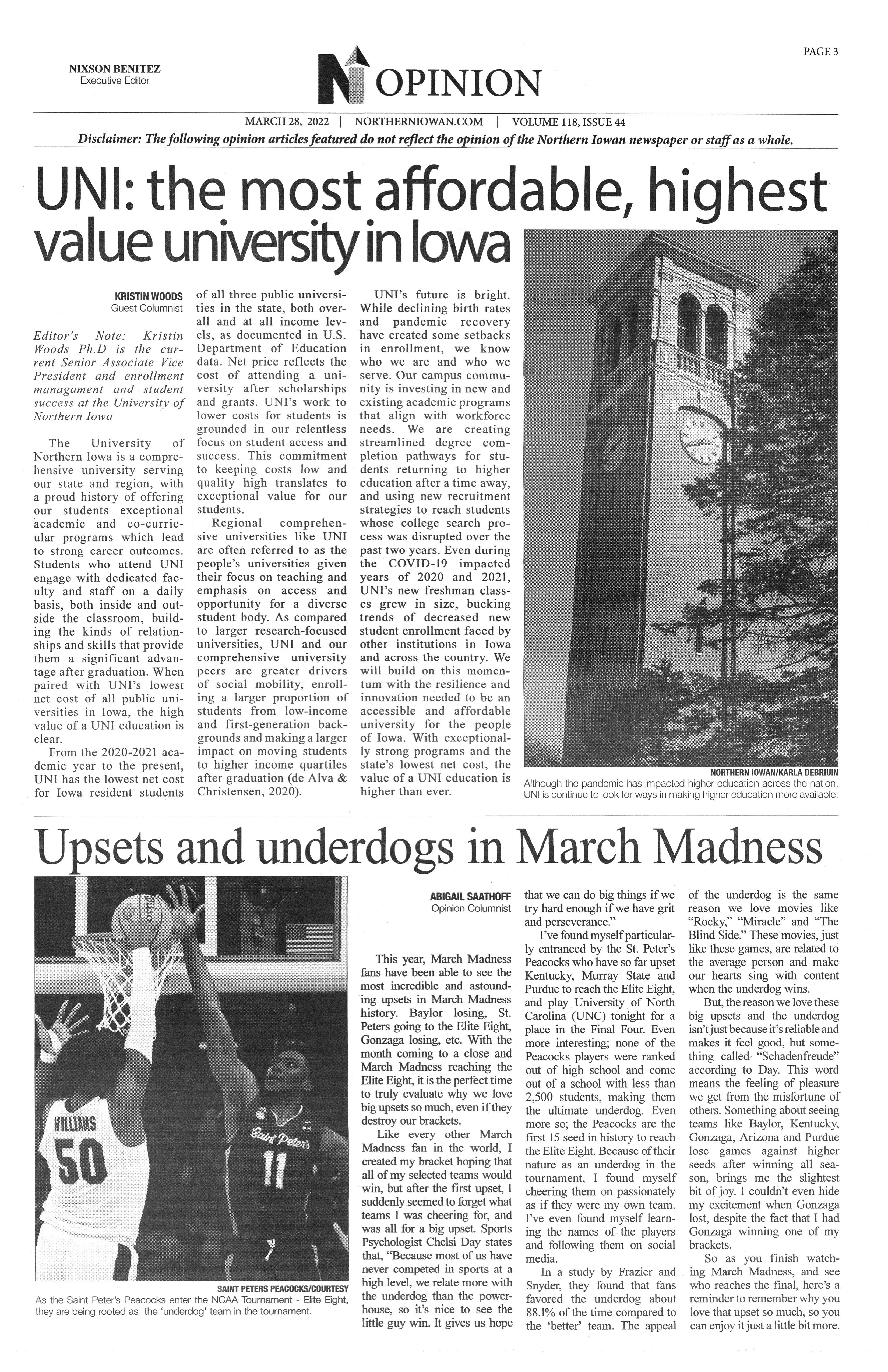 | UNI: the most affordable, highest value university in Iowa | Guest columnist Kristin Woods, Ph.D, explains the benefits of attending UNI; photo. |