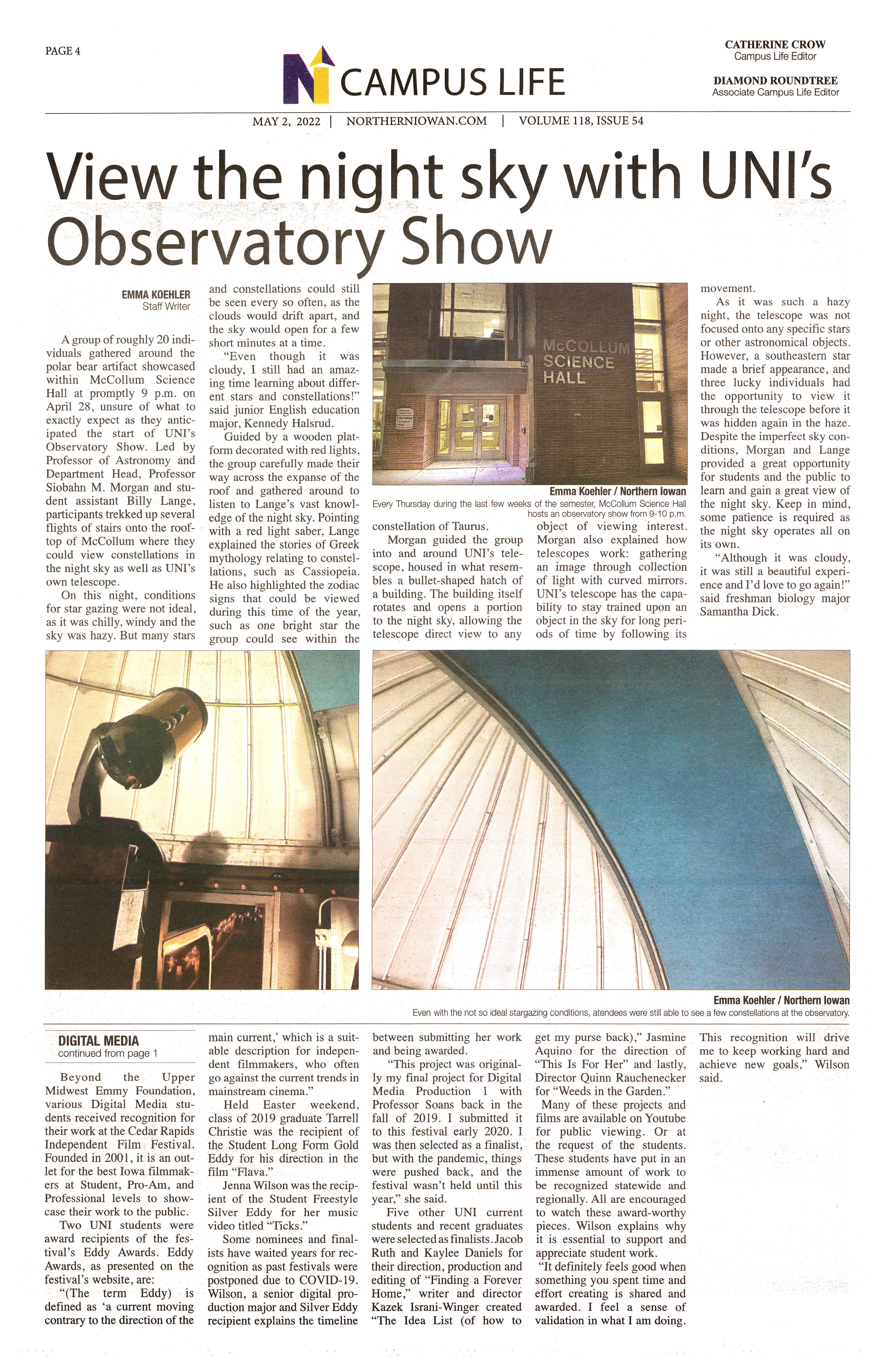 | View the night sky with UNI's Observatory Show | UNI students gather on McCollum Science Hall's rooftop to watch the Observatory Show led by Professor Siobahn M. Morgan and a student assistant, Billy Lange; photo. |