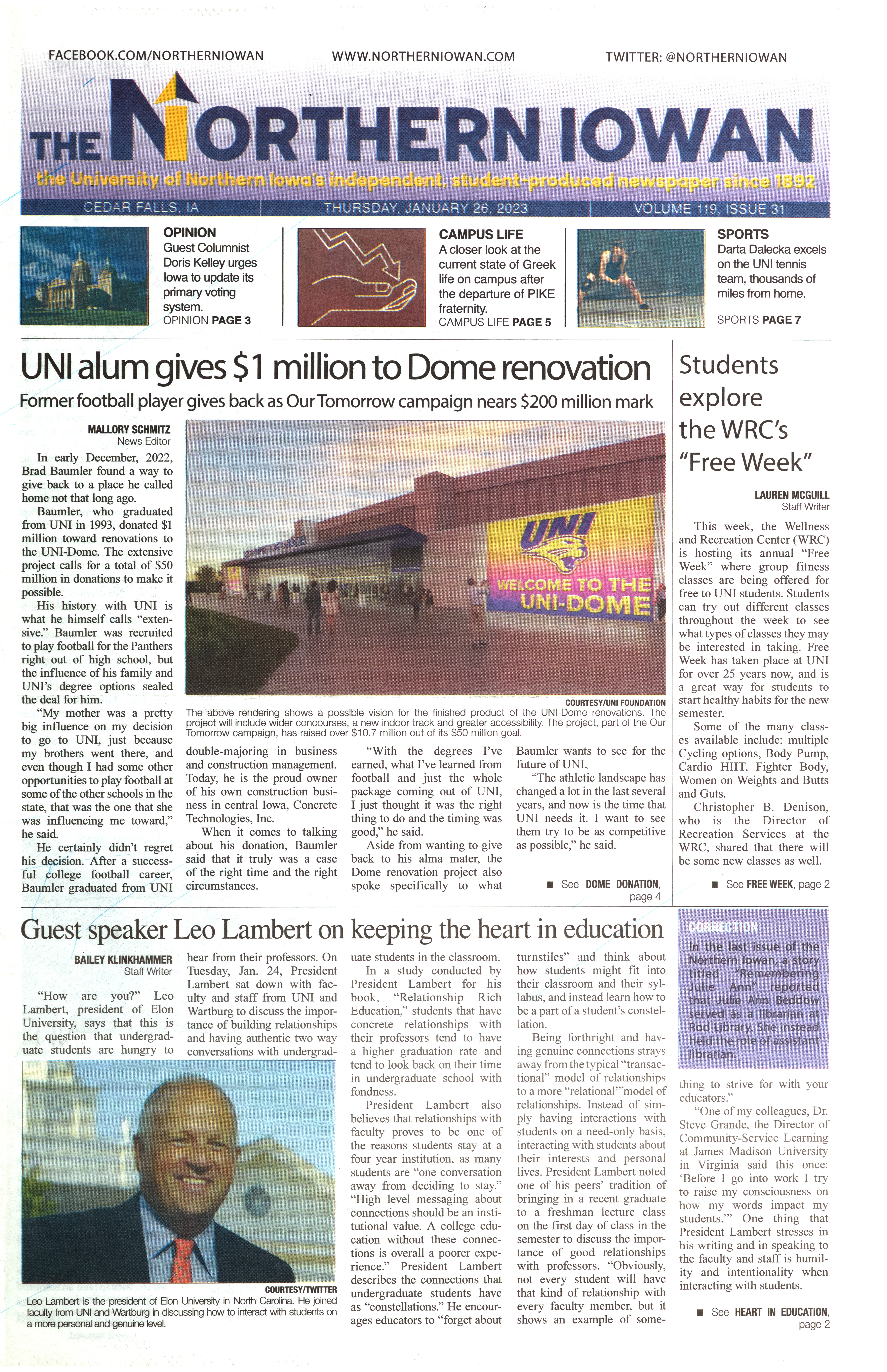 UNI alum gives $1 million to Dome renovation Former UNI football player Brad Baumler donated $1 million toward the planned UNI-Dome renovations. Mallory Schmitz interviews Baumler who shares the impact that UNI had on his life; photo.